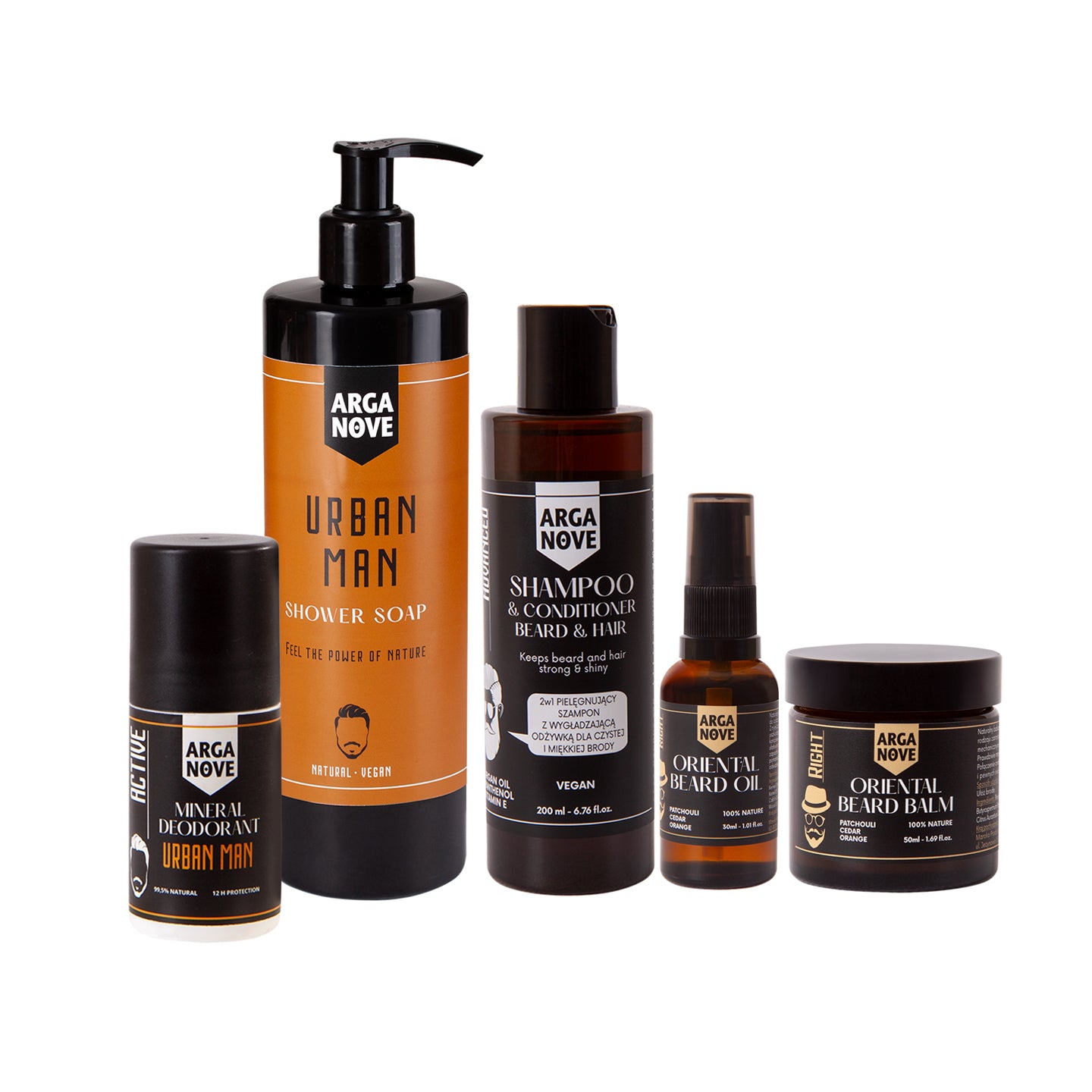 W zestawie: Mydło oliwne pod prysznic Urban Men 400ml, Szampon 2w1 do brody i włosów 200ml, Dezodorant mineralny Urban Men rollon 50ml, Orientalny olejek do brody i wąsów 30 ml, Orientalny balsam do brody i wąsów 50 ml.
