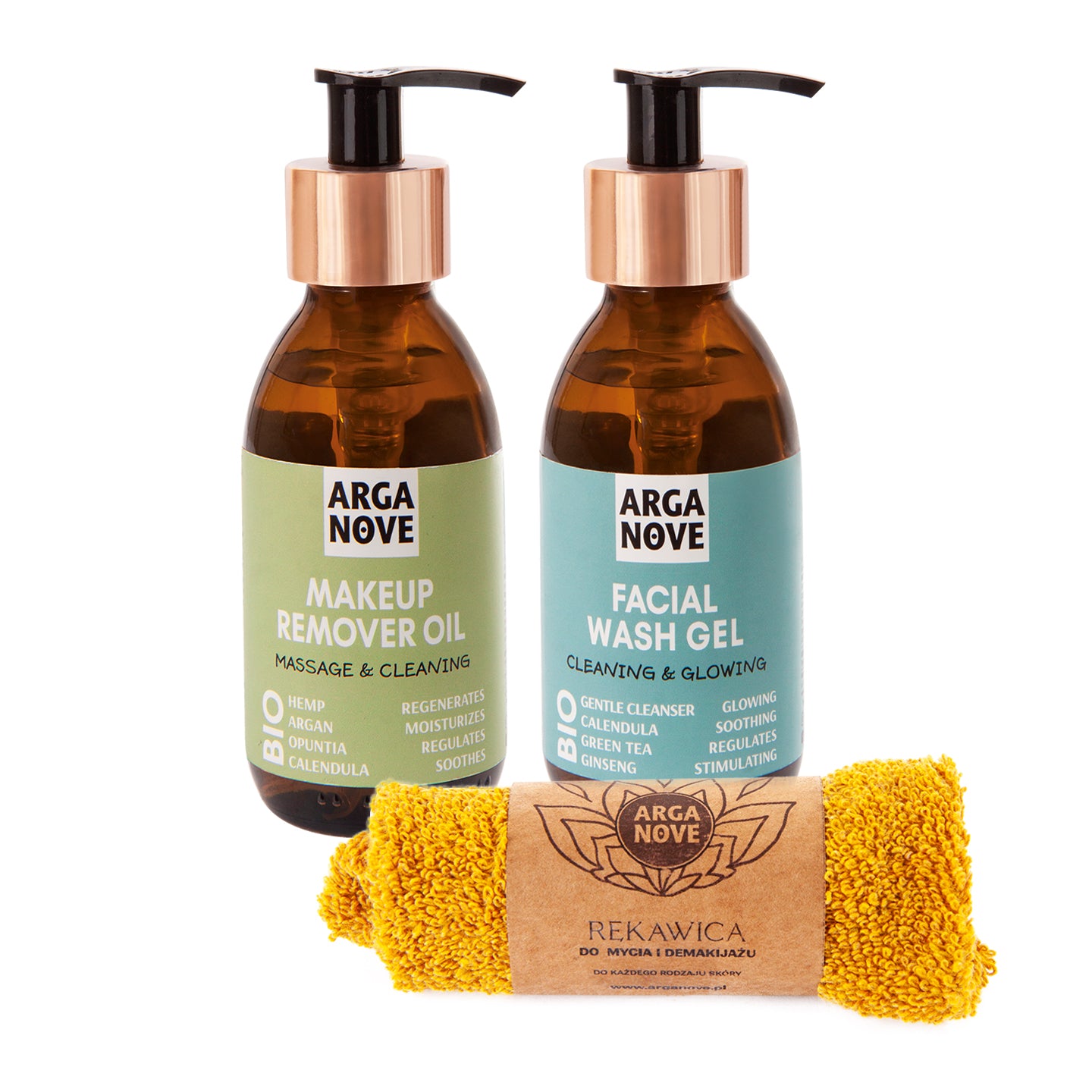 W zestawie: Olejek 2w1 do demakijażu i masażu twarzy BIO 150ml, Żel do mycia twarzy rozświetlająco-pobudzajacy 150 ml, Rękawica frotte do mycia.