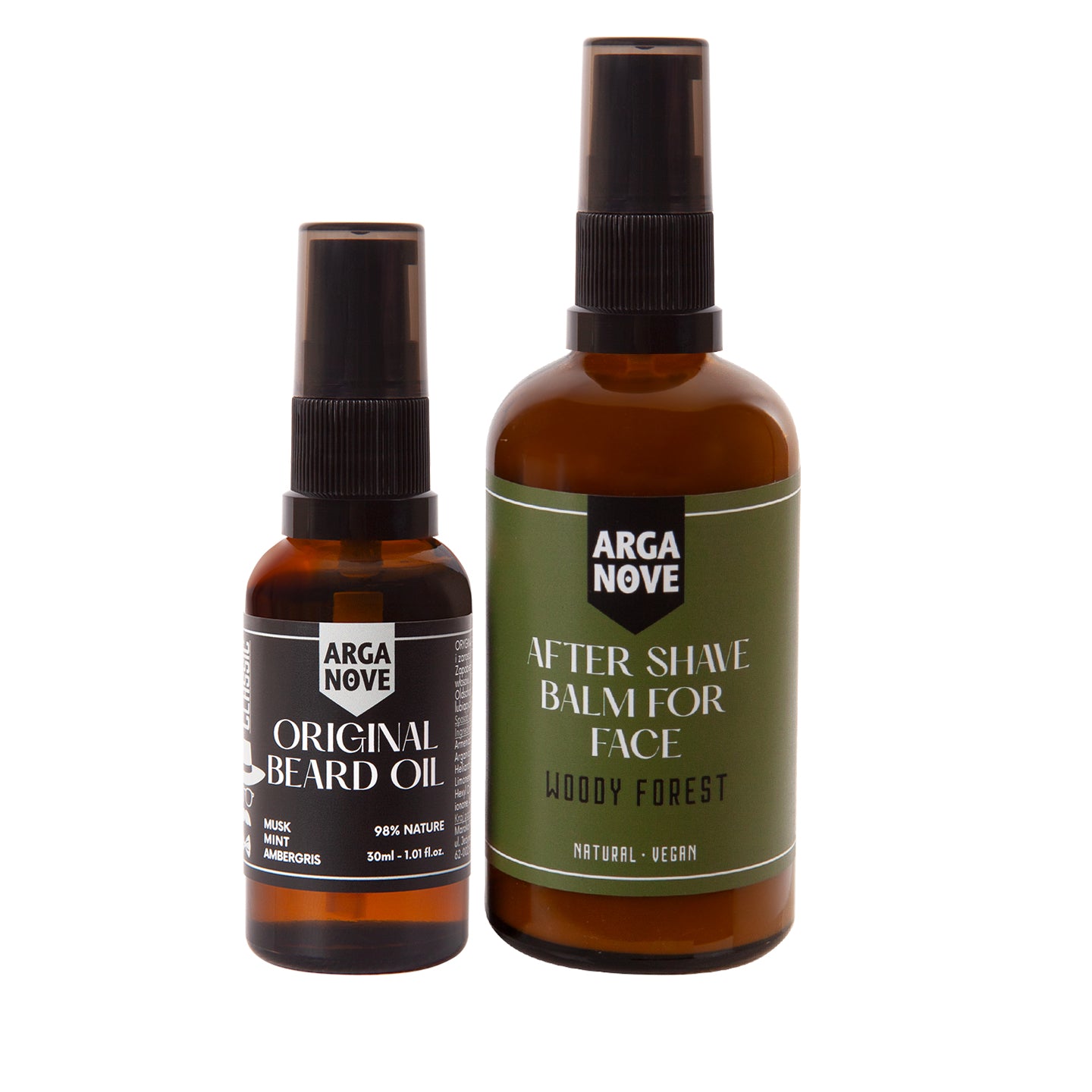 W zestawie: Naturalny łagodzący balsam po goleniu Woody Forest 100 ml, Olejek do pielęgnacji brody i twarzy Oryginalny 30 ml.