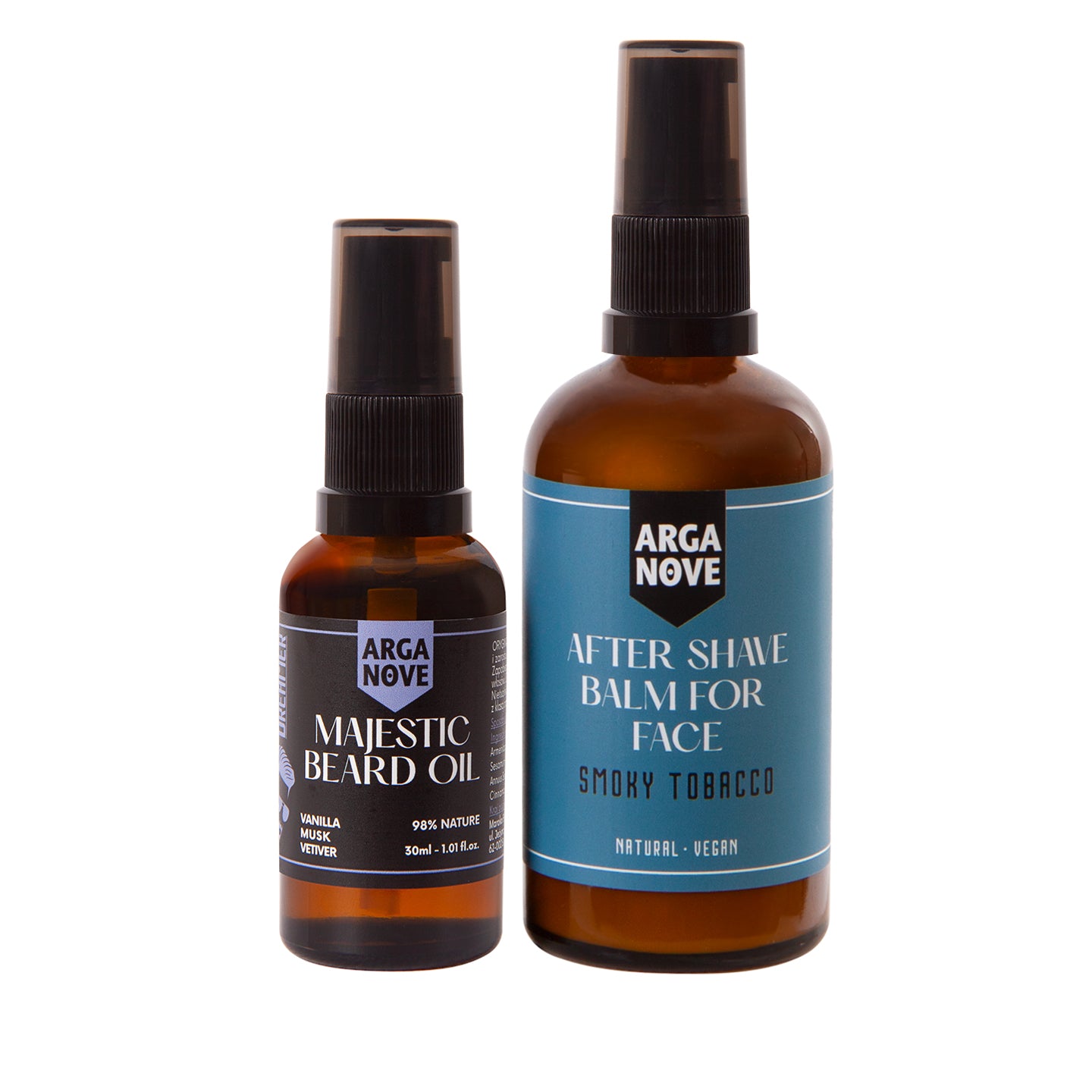 W zestawie: Naturalny łagodzący balsam po goleniu Smoka Tobacco 100 ml, Olejek do pielęgnacji brody i twarzy Majestic 30 ml.