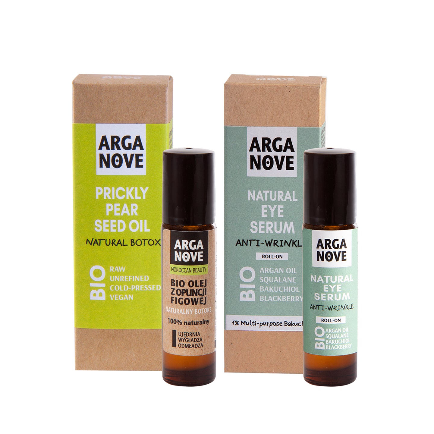 W zestawie: 100% Olej z nasion opuncji figowej 10ml, Przeciwzmarszczkowe serum pod oczy z bakuchiolem 10 ml.