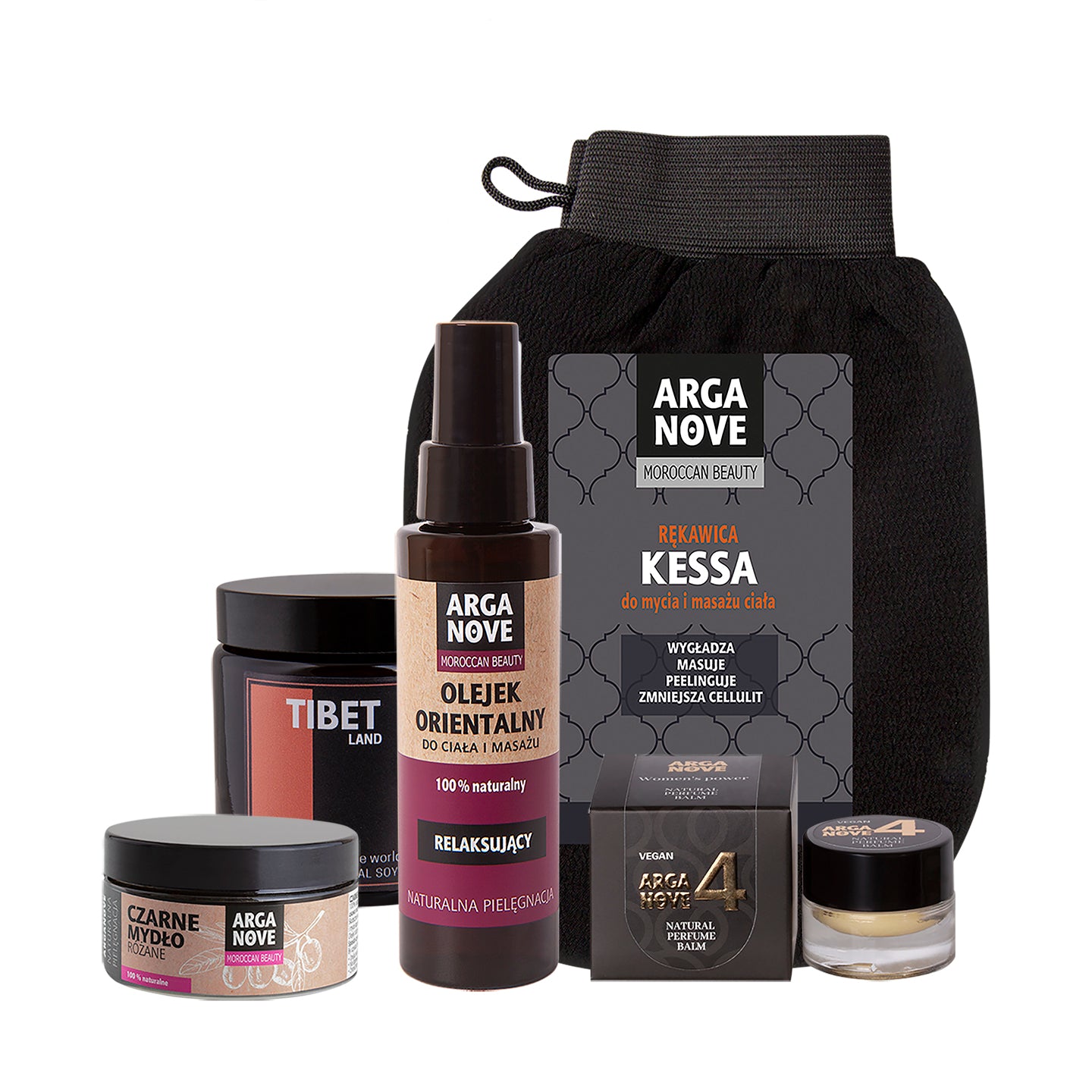 W zestawie: Marokańskie czarne mydło w paście z olejkiem różanym 100g, Marokańska Rękawica Kessa, Orientalny olejek do ciała i masażu 100 ml, Perfum w balsamie do ciała Nr 4 - Women's Powers 6g, Świeca sojowa Tibet Land 100ml.